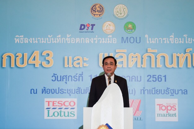 พล.อ.ประยุทธ์ จันทร์โอชา นายกรัฐมนตรี เป็นประธานการลงนามบันทึกข้อตกลงความร่วมมือ (MOU) การเชื่อมโยงข้าว กข 43 และผลิตภัณฑ์น้ำนมข้าว เพื่อเชื่อมโยงการรับซื้อข้าว กข 43 ระหว่างผู้ประกอบการแปรรูปข้าว 7 ราย การรับซื้อข้าวจากสหกรณ์การเกษตร 8 ราย ปริมาณผลผลิต 1,121 ตันข้าวเปลือก เพื่อนำออกขายผ่านโมเดิร์นเทรด 4 ราย ได้แก่ เทสโก้โลตัส บิ๊กซี ซูเปอร์เซ็นเตอร์ เดอะมอลล์ กรุ๊ป และเซ็นทรัลฟูดส์ เพื่อวางจำหน่ายข้าว กข43 โดยไม่คิดค่าใช้จ่าย 60 บาท/กก. ราคาสูงกว่าข้าวปทุมธานีแต่ไม่สูงกว่าข้าวหอมมะลิ เริ่มตั้งแต่วันที่ 15 พฤษภาคม 2561 เป็นต้นไป พร้อมเดินหน้าประชาสัมพันธ์สร้างการรับรู้ให้แก่ผู้บริโภคในประเทศทุกช่องทาง เพื่อให้บริโภคข้าว กข43 มากขึ้น ผ่านนโยบายการตลาดนำการผลิต เมื่อมีผู้รับซื้อชาวนาจะได้หันมาปลูกมากขึ้น