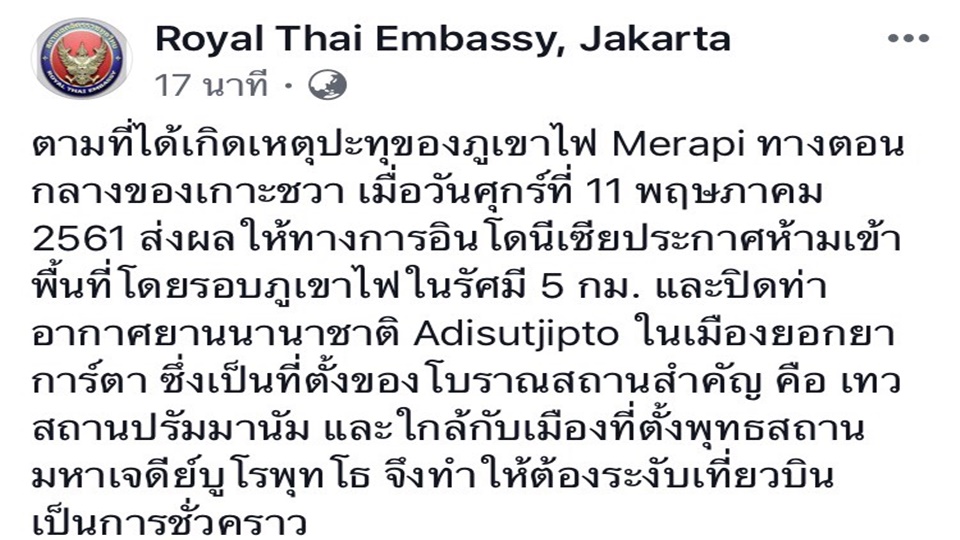สถานเอกอัครราชทูต ณ กรุงจาการ์ตา อินโดนีเซีย โพสข้อความผ่านทาง เฟสบุ๊ค ระบุว่า ตามที่ได้เกิดเหตุปะทุของภูเขาไฟ Merapi ทางตอนกลางของเกาะชวา วันนี้ (11 พ.ค.) ส่งผลให้ทางการอินโดนีเซียประกาศห้ามเข้าพื้นที่โดยรอบภูเขาไฟในรัศมี 5 กม. และปิดท่าอากาศยานนานาชาติ Adisutjipto ในเมืองยอกยาการ์ตา ซึ่งเป็นที่ตั้งของโบราณสถานสำคัญ คือ เทวสถานปรัมมานัม และใกล้กับเมืองที่ตั้งพุทธสถานมหาเจดีย์บูโรพุทโธ จึงทำให้ต้องระงับเที่ยวบินเป็นการชั่วคราว
