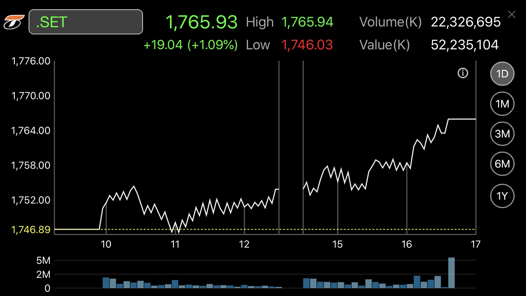 ผู้สื่อข่าวรายงานว่าดัชนีตลาดหลักทรัพย์ฯ ปิดวันนี้ (11 พ.ค.) ที่ระดับ 1,765.93 จุด เพิ่มขึ้น 19.04 จุด หรือร้อยละ 1.09 มูลค่าการซื้อขาย 52,235.10 ล้านบาท การซื้อขายหุ้นวันนี้ ดัชนีหุ้นไทยเคลื่อนไหวแดนบวกเป็นส่วนใหญ่ โดยดัชนีฯ แตะจุดสูงสุดที่ 1,765.94 จุด และต่ำสุดที่ระดับ 1,746.03 จุด ตลาดหุ้นไทยฟื้นตัว เนื่องจากต่างชาติกลับมาซื้อสุทธิหุ้นไทยส่งผลเงินบาทกลับมาแข็งค่า