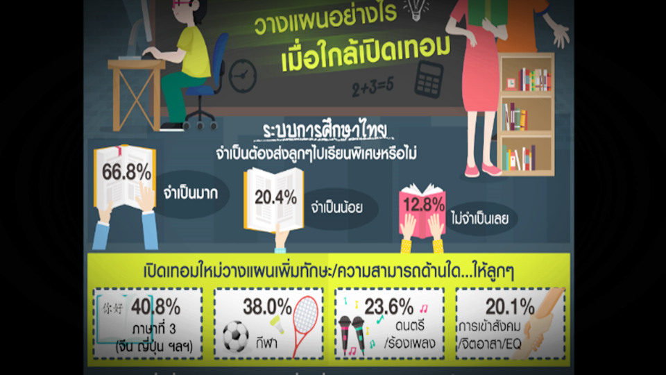 กทม.12 พ.ค.- ผลสำรวจ “พ่อแม่ยุคใหม่วางแผนอย่างไรเมื่อใกล้เปิดเทอม” พบกลุ่มตัวอย่างเกินครึ่ง ระบุจะส่งลูกไปเรียนพิเศษเพิ่มเพราะจำเป็นมากในระบบการศึกษาปัจจุบัน โดยเฉพาะภาษาที่ 3 พร้อมขอรัฐบาลสนับสนุนสร้างหลักสูตรทางเลือกที่หลากหลายเหมาะกับศักยภาพเด็ก ให้ครูสอนเต็มที่จะได้ไม่ต้องให้ลูกไปเรียนพิเศษเพิ่ม