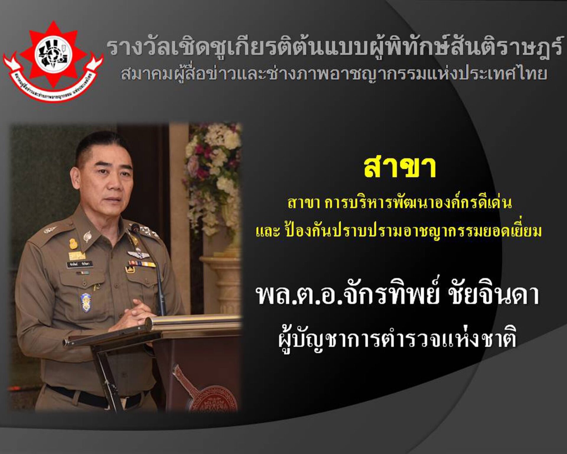 1.พล.ต.อ.จักรทิพย์ ชัยจินดา ผบ.ตร. สาขาการบริหารพัฒนาองค์กรดีเด่นและป้องกันปราบปรามอาชญากรรมยอดเยี่ยม การก้าวเข้ามาสู่ปีที่ 3 ของ พล.ต.อ.จักรทิพย์ บนเก้าอี้ผู้นำสูงสุดของตำรวจ กับสถานการณ์งานที่หนักอึ้งหลายด้าน ตั้งแต่งานพื้นฐานคดีอาชญากรรม งานกิจการพิเศษ เหตุอุทกภัยน้ำท่วมใหญ่ในหลายพื้นที่ ก็นำพาองค์กรตำรวจฝ่าฟันอุปสรรคได้เป็นอย่างดี กอบกู้ภาพลักษณ์ขององค์กรตำรวจ โดยเน้นความสามัคคีของตำรวจทุกคน และการดำเนินงานของทุกหน่วยงานในสังกัดมุ่งผลลัพธ์ไปสู่จุดหมายเดียวกันคือ ความปลอดภัยในชีวิตและทรัพย์สินของประชาชน และความยุติธรรม