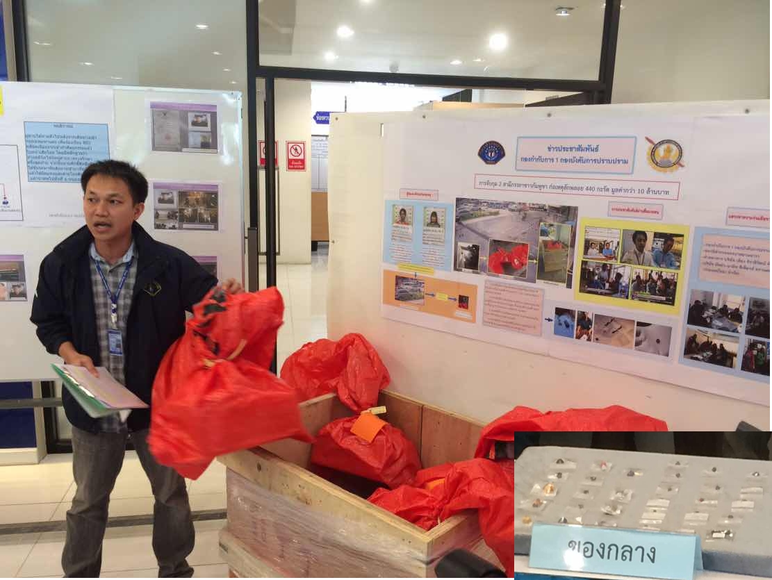 พันตำรวจเอกศิร์ธัชเขต รูวัฒนเศรษฐ์ รองผู้บังคับการกองปราบปราม กล่าวว่า เจ้าหน้าที่สอบปากคำพยานและตรวจสอบกล้องวงจรปิดจนทราบว่าทั้ง 2 คนมีพฤติกรรมน่าสงสัย จึงเข้าค้นห้องพักย่านสาทร พบของกลางบางส่วน พร้อมยอมรับว่าอาศัยช่วงที่พนักงานบริษัทขนส่งลืมเอาสินค้าไปแสดงที่งาน จึงเข้าไปหยิบพลอยออกมาจำนวนหนึ่ง แล้วขายให้เพื่อนชาวกัมพูชาที่หนีออกนอกประเทศไปแล้ว เบื้องต้นตำรวจแจ้งข้อหาร่วมกันลักทรัพย์ ส่วนพลอยที่ยังหายไปอยู่ระหว่างติดตามส่งคืนเจ้าของ พร้อมประชาสัมพันธ์หากพบเห็นพลอยลักษณะนี้หรือมีไว้ในครอบครองให้ส่งคืนตำรวจ เพื่อไม่ถูกต้องข้อหารับซื้อของโจร.-สำนักข่าวไทย
