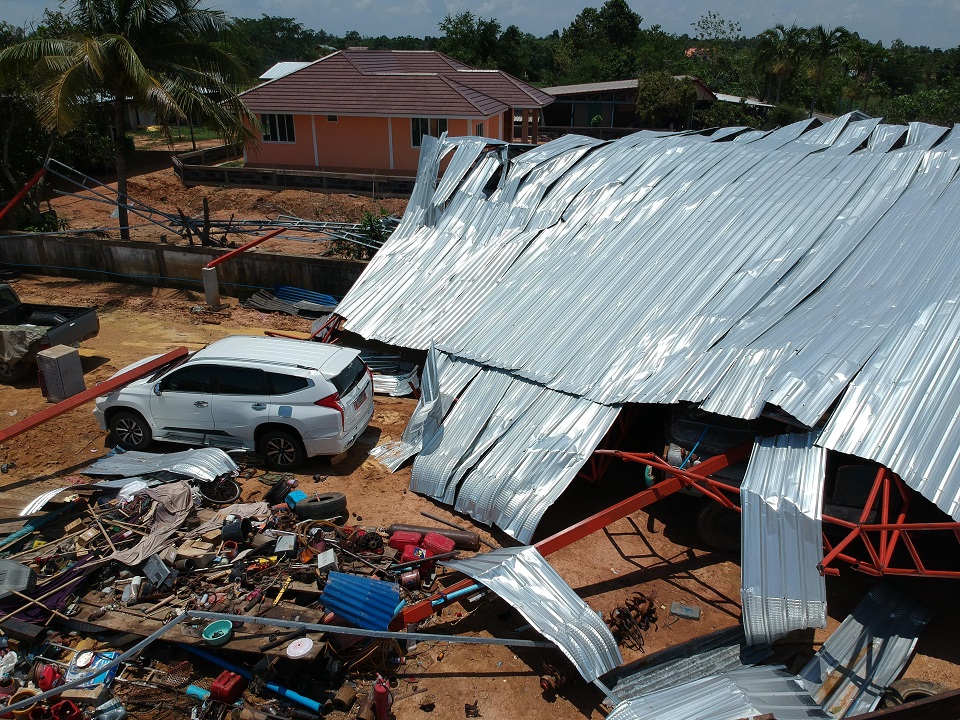 ผู้สื่อข่าวรายงานเพิ่มเติมว่า ที่บ้านลาดเจริญ หมู่ 22 ต.ศรีสุข อ.กันทรวิชัย อาคารจอดรถบรรทุกและรถเกี่ยวข้าว ขนาดความกว้าง 25 เมตร ยาว 35 เมตร และสูง 6 เมตร ไม่สามารถต้านแรงลมไว้ได้ ทำให้เสาเหล็กหักงอ 8 ต้น และคานที่ยึดไว้พังเสียหาย ทำให้พังลงมาทั้งหมดและทับรถบรรทุก 6 ล้อ รถยนต์ส่วนตัวเสียหาย 5 คัน