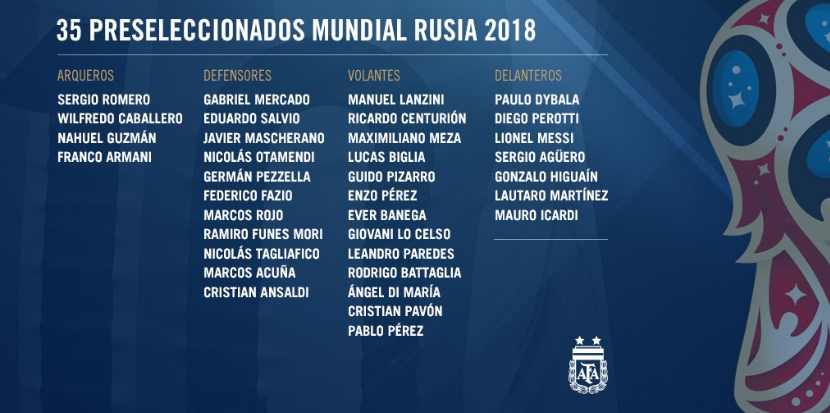 ฮอร์เก้ ซามเปาลี กุนซือทีมชาติอาร์เจนติน่า ประกาศรายชื่อนักเตะชุดแรก 35 คน ที่จะลุยศึกฟุตบอลโลก 2018 รอบสุดท้าย ที่ประเทศรัสเซียออกมาแล้วนำโดยกำลังหลักในแนวรุก ลีโอเนล เมสซี (บาร์เซโลน่า), กอนซาโล อิกัวอิน (ยูเวนตุส), เซร์คิโอ อเกวโร (แมนฯซิตี้), เปาโล ดีบาลา (ยูเวนตุส), เมาโร อีการ์ดี้ (อินเตอร์ มิลาน)
