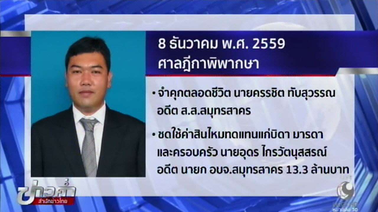 สมุทรสาคร 8 ธ.ค.-วันนี้ ศาลฎีกาพิพากษาจำคุกตลอดชีวิต นายครรชิต ทับสุวรรณ อดีต ส.ส.สมุทรสาคร ที่ใช้ปืนกระหน่ำยิงนายอุดร ไกรวัตนุสสรณ์ นายก อบจ.สมุทรสาคร เสียชีวิตเมื่อ 5 ปีก่อน