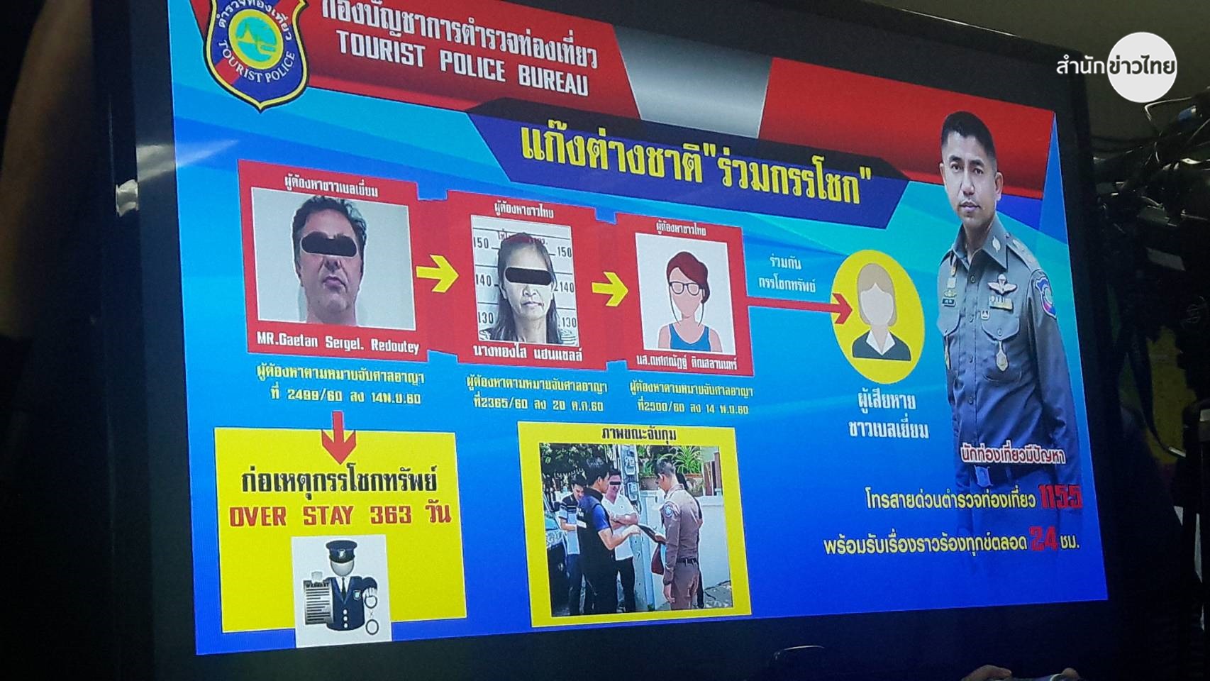 พล.ต.ต.สุรเชษฐ์ หักพาล รองผู้บัญชาการตำรวจท่องเที่ยว แถลงจับนายเกตัน เซอร์เจล รีเดอเตย์ (Gaetan Sergel Rsdoutey) สัญชาติเบลเยียม และนางทองใส แฮนด์แซลล์ ผู้ต้องหาตามหมายจับศาลอาญา ข้อหาร่วมกันกรรโชกทรัพย์ ที่บ้านพักใน อ.บางละมุง จ.ชลบุรี