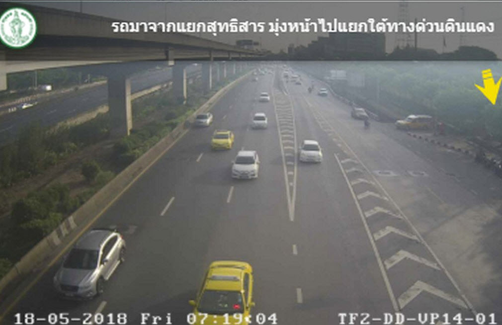 ถนนวิภาวดี – รังสิต ขาเข้า จากสุทธิสาร มุ่งหน้าใต้ด่วนดินแดง ผ่านโรงเรียนสุรศักดิ์มนตรี ยังเคลื่อนตัวดี เข้าใต้ทางด่วนมีชะลอตัวเล็กน้อย