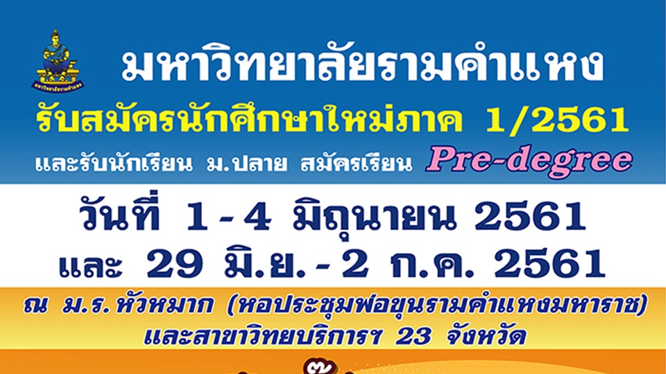 มหาวิทยาลัยรามคำแหง แจ้งว่า มหาวิทยาลัยฯ กำหนดเปิดรับสมัครนักศึกษาใหม่ระดับปริญญาตรี ภาค1 ปีการศึกษา2561ทั้งส่วนกลาง(หัวหมาก)และส่วนภูมิภาค(23จังหวัด)ระหว่างวันที่1-4 มิ.ย.และ29 มิ.ย.-2 ก.ค.2561(ทุกวัน)หรือสมัครทางอินเทอร์เน็ตที่ www.iregis2.ru.ac.th ตั้งแต่บัดนี้ -2 ก.ค.2561 รวมทั้งเปิดรับนักเรียนชั้นมัธยมศึกษาตอนปลายเข้าศึกษาในระบบ Pre-degree เพื่อสะสมหน่วยกิตล่วงหน้า โดยสามารถ นำหน่วยกิตมาเทียบโอนได้เมื่อจบ ม.6