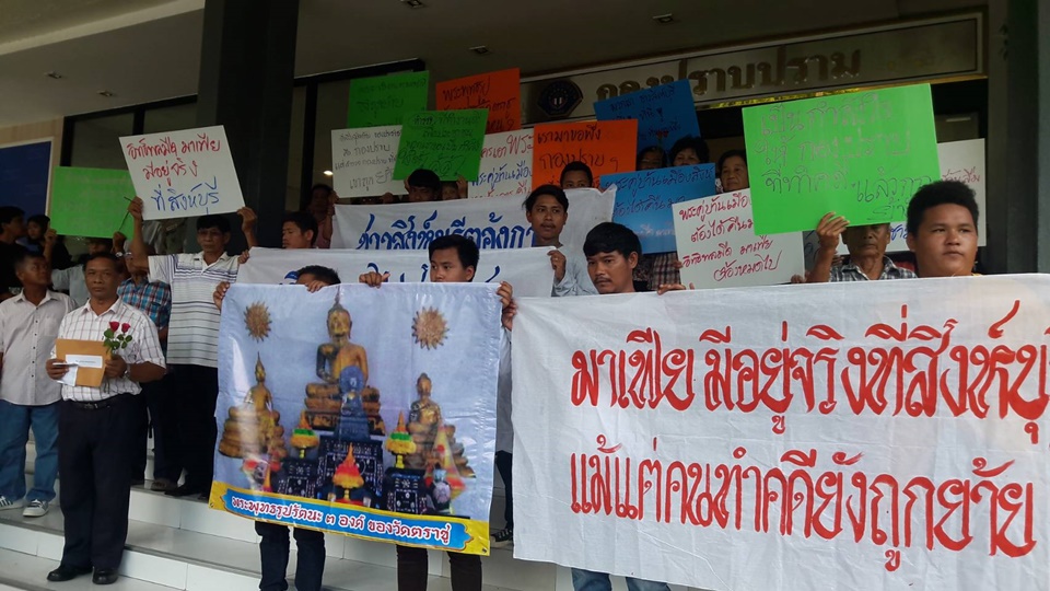 ชาวบ้าน ต.บ้านหม้อ อ.พรหมบุรี จ.สิงห์บุรี กว่า 50 คน เดินทางเข้ายื่นหนังสือถึง พล.ต.ต ไมตรี ฉิมเฉิด ผู้บังคับการกองปราบปราม เพื่อร้องเรียนให้เร่งรัดติดตาม พระรัตนะ พระพุทธรูปเก่าแก่ ล้ำค่า 3 องค์ ของวัดตราชู ที่หายไปอย่างปริศนาเป็นเวลากว่า 1 ปี