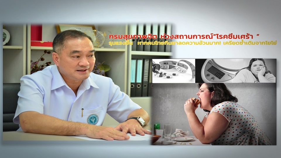 กรมสุขภาพจิต 18 พ.ค.- กรมสุขภาพจิตห่วงสถานการณ์โรคซึมเศร้ารุนแรงขึ้น เหตุคนไทยกินยาลดความอ้วนมาก เครียดซ้ำเติมจากโยโย่ แนะการลดน้ำหนักดีที่สุดคือออกกำลังกาย ลดได้ทั้งความเครียด น้ำหนักตัว แต่ต้องใช้เวลา