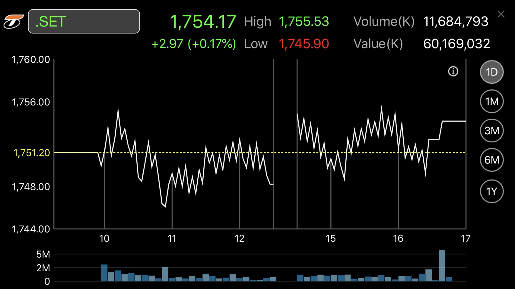 ผู้สื่อข่าวรายงานว่า ตลาดหลักทรัพย์ปิดการซื้อขายวันนี้ที่ระดับ 1,754.17 จุด เพิ่มขึ้น 2.97 จุด หรือ ร้อยละ 0.17 มูลค่าการซื้อขาย 60,169.03 ล้านบาท