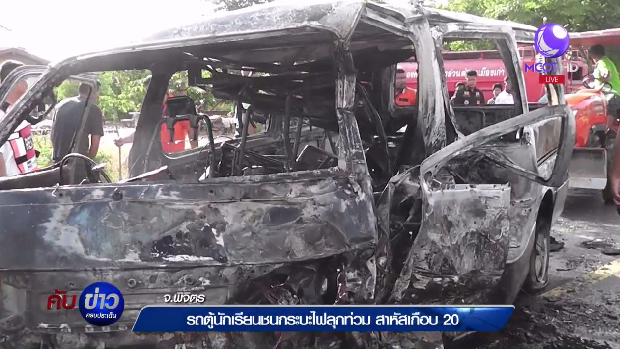 พิจิตร 18 พ.ค.-เกิดอุบัติเหตุรถตู้รับ-ส่ง นักเรียนชนประสานงากับรถกระบะ จนไฟลุกไหม้รถตู้นักเรียน เจ็บสาหัสเกือบ 20 ราย