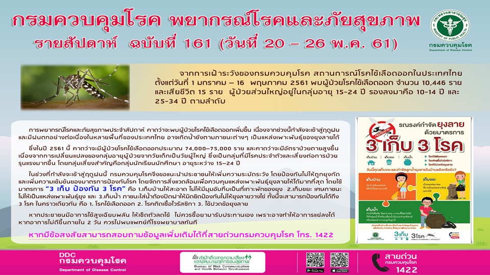 นายแพทย์สุวรรณชัย วัฒนายิ่งเจริญชัย อธิบดีกรมควบคุมโรค เปิดเผยว่า จากการเฝ้าระวัง สถานการณ์โรคไข้เลือดออกในประเทศไทย ตั้งแต่วันที่ 1 มกราคม –16 พฤษภาคม 2561 พบผู้ป่วยโรคไข้เลือดออก จำนวน 10,446 ราย และเสียชีวิต 15 ราย ผู้ป่วยส่วนใหญ่อยู่ในกลุ่มอายุ 15-24 ปี รองลงมาคือ 10-14 ปี และ 25-34 ปี ตามลำดับ