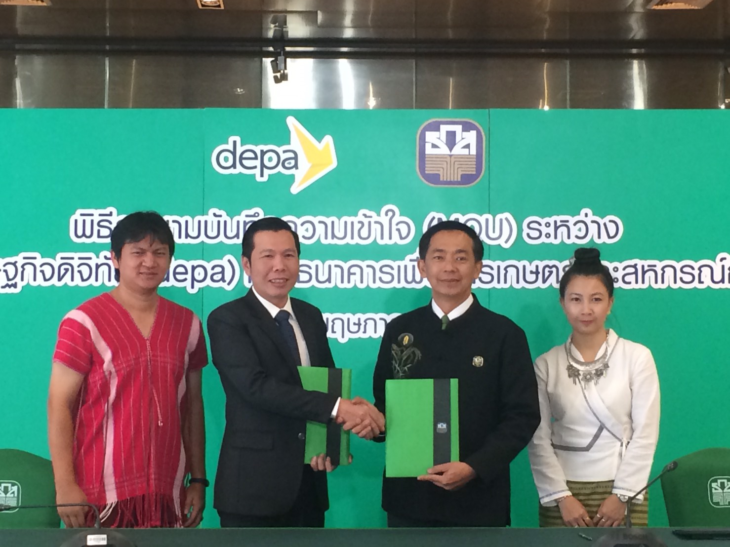 นายอภิรมย์ สุขประเสริฐ ผู้จัดการ ธนาคารเพื่อการเกษตรและสหกรณ์การเกษตร (ธ.ก.ส.) และนายณัฐพล นิมมานพัชรินทร์ ผู้อำนวยการ สำนักงานส่งเสริมเศรษฐกิจดิจิทัล หรือดีป้าได้ร่วมลงนามบันทึกข้อตกลงความเข้าใจว่าด้วย “การส่งเสริมและสนับสนุนการประยุกต์ใช้เทคโนโลยีและนวัตกรรมดิจิทัล” เพื่อส่งเสริมสนับสนุนการประยุกต์ใช้เทคโนโลยีและนวัตกรรมดิจิทัลนำมาพัฒนาชุมชนให้เกิดมูลค่าเพิ่มทางเศรษฐกิจ