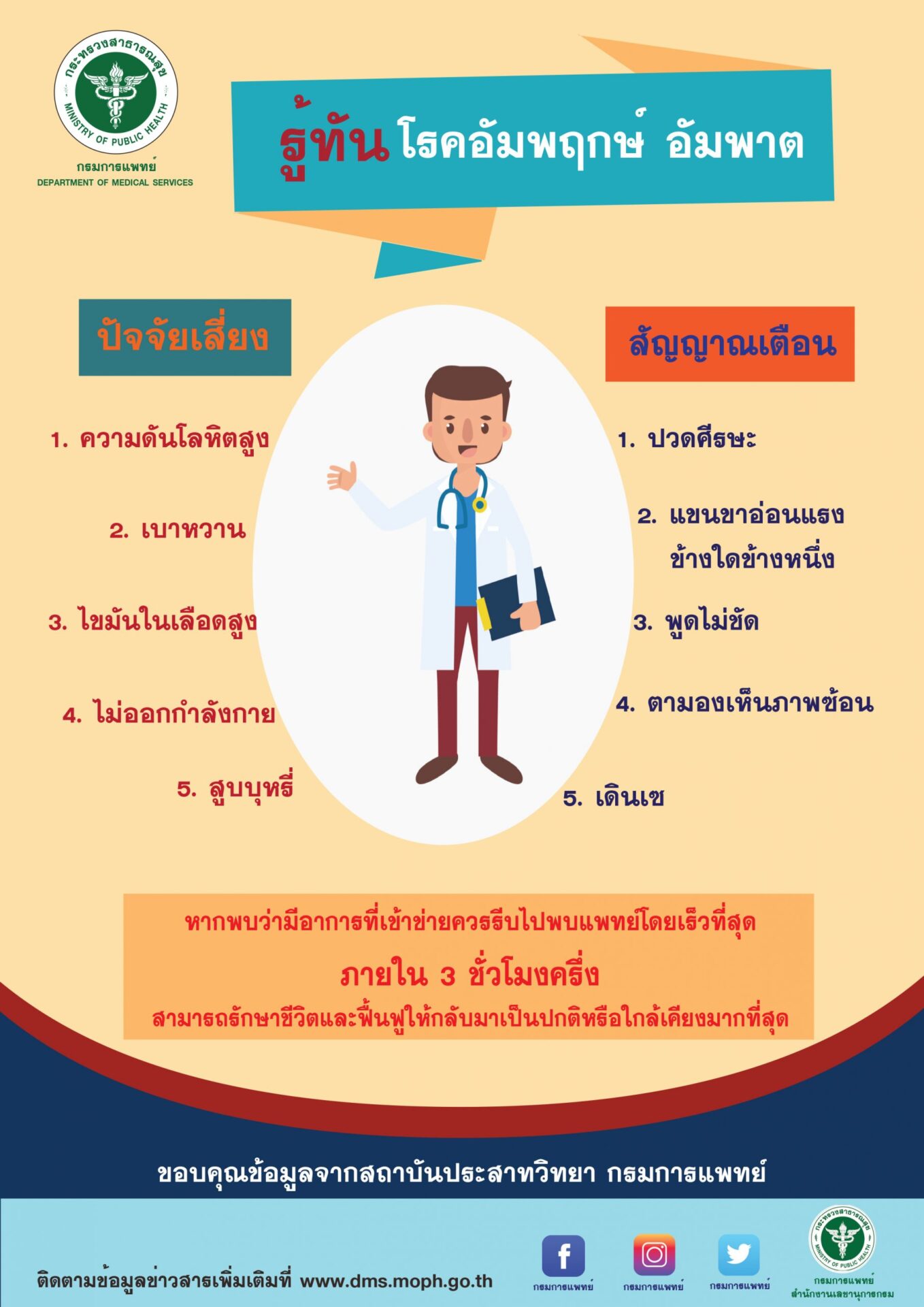 ซึ่งอาการเหล่านี้มักเกิดฉับพลันให้รีบมาพบแพทย์ด่วนที่สุดภายใน 3 ชั่วโมงครึ่ง