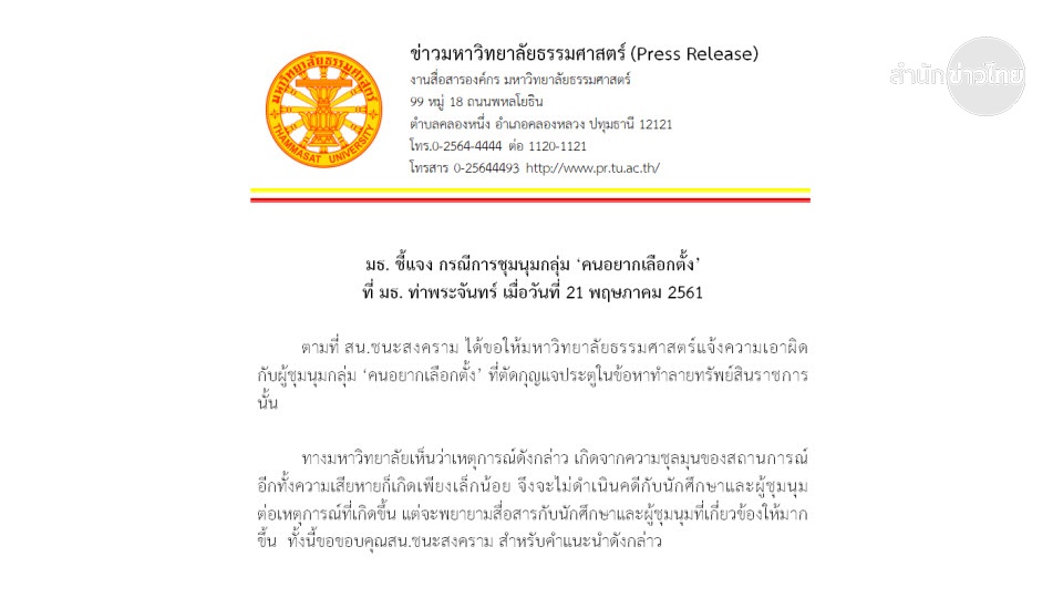 มหาวิทยาลัยธรรมศาสตร์ออกแถลงการณ์กรณี สน.ชนะสงคราม ขอให้มหาวิทยาลัยธรรมศาสตร์แจ้งความเอาผิดกับผู้ชุมนุมกลุ่มคนอยากเลือกตั้งที่ตัดกุญแจประตู เมื่อวันที่ 21 พฤษาคม 2561 ในข้อหาทำลายทรัพย์สินราชการ