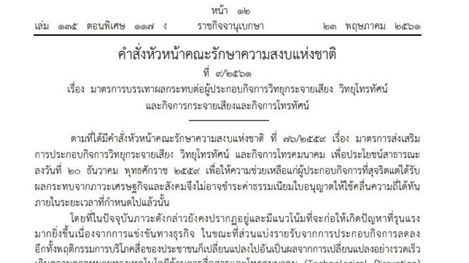 ผู้สื่อข่าวรายงานว่า เมื่อเวลา15.00 น. เว็บไซต์ราชกิจจานุเบกษา ประกาศคําสั่งหัวหน้าคณะรักษาความสงบแห่งชาติ ที่ 9/2561 เรื่อง มาตรการบรรเทาผลกระทบต่อผู้ประกอบกิจการวิทยุกระจายเสียง วิทยุโทรทัศน์ และกิจการกระจายเสียงและกิจการโทรทัศน์