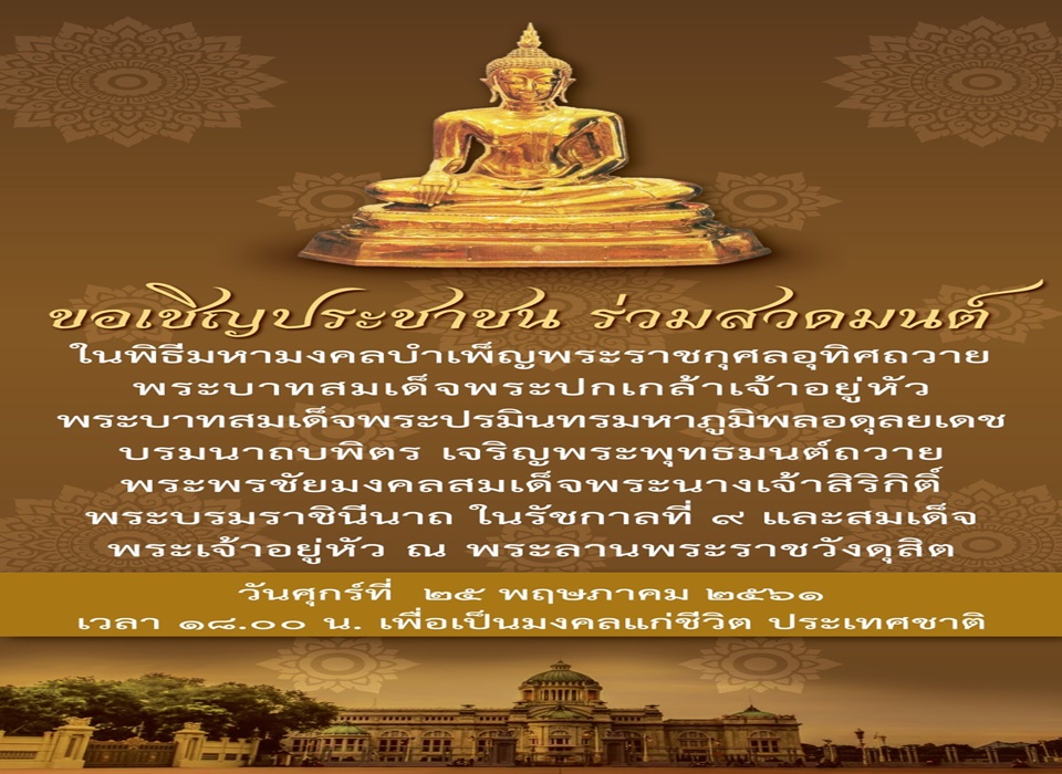 พ.ต.อ.ภูษิต วิเศษคามินทร์ รอง ผบก.จร.(งานกิจการพิเศษ) เปิดเผยถึงการจัดจราจร รองรับงานพิธีมหามงคลบำเพ็ญพระราชกุศล อุทิศถวายพระบาทสมเด็จพระปกเกล้าเจ้าอยู่หัว พระบาทสมเด็จพระปรมินทรมหาภูมิพลอดุลยเดชบรมนาถบพิตร เจริญพระพุทธมนต์ถวายพระพรชัยมงคลสมเด็จพระนางเจ้าสิริกิติ์ พระบรมราชินีนาถ ในรัชกาลที่ 9 และสมเด็จพระเจ้าอยู่หัว ในวันศุกร์ที่ 25 พฤษภาคม 2561 ณ พระลานพระราชวังดุสิตกรุงเทพมหานคร ว่าที่ประชุมคณะทำงานการจัดงานได้พิจารณาปิดถนนพระลานพระราชวังดุสิตตั้งแต่บัดนี้เป็นต้นไป พร้อมจะจัดเดินรถทางเดียว ในวันที่ 25 พ.ค. จากแยกสวนมิกสกวัน ถ.ราชดำเนินนอก ให้มาเลี้ยวซ้ายขวา ที่แยกลานพระรูป ตั้งแต่ 16.00 น. เบื้องต้นหากมีประชาชนจำนวนมากจะมีการพิจารณาปิดถนนอีกครั้ง