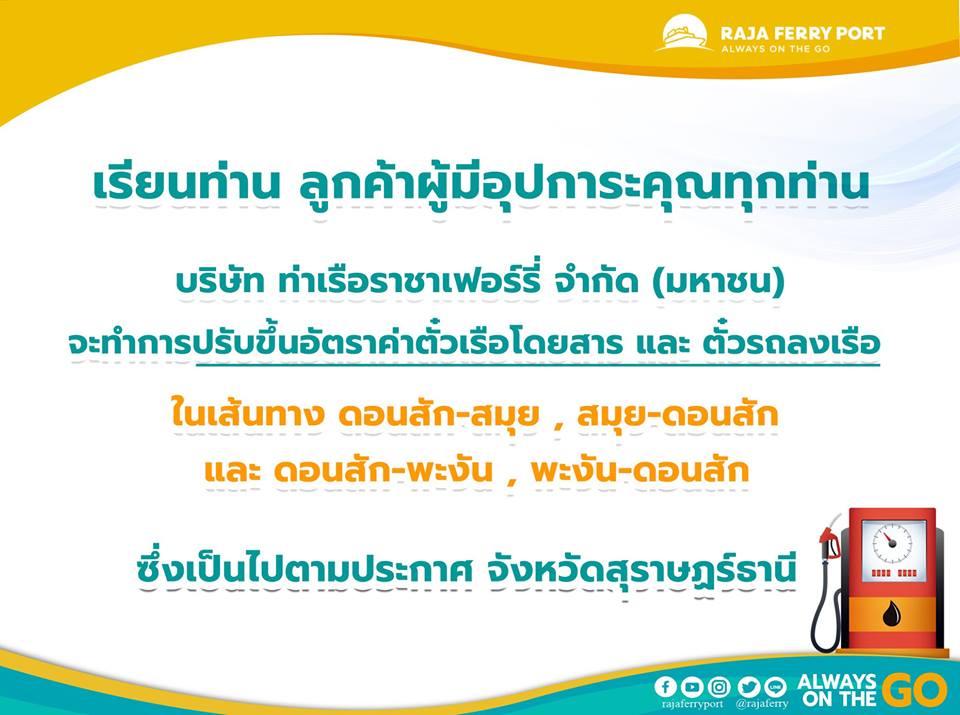 ผู้สื่อข่าวรายงานจากจังหวัดสุราษฎร์ธานีกรณีสถานการณ์ของราคาน้ำมันเชื้อเพลิงในระยะนี้มีการปรับตัวสูงขึ้น โดยน้ำมันดีเซลลิตรละกว่า 30 บาทแล้วว่า ล่าสุด (23 พ.ค.) บริษัท ท่าเรือราชาเฟอร์รี่ จำกัด (มหาชน) ประกาศผ่านเว็บไซด์ Raja Ferry Port แจ้งปรับขึ้นค่าโดยสารเรือเฟอรี่ข้ามฟากทุกประเภทเฉลี่ย 5-200 บาท ทั้งตั๋วผู้โดยสารและตั๋วรถลงเรือในเส้นทางดอนสัก-สมุย-ดอนสัก และดอนสัก-พะงัน-ดอนสัก เพื่อให้สอดคล้องกับราคาน้ำมัน และเป็นไปตามประกาศของจังหวัดสุราษฎร์ธานี ซึ่งกำหนดไว้ตั้งแต่ปี 2551 ให้ผู้ประกอบการใช้อัตราค่าโดยสารตามอัตราการขึ้นลงของราคาน้ำมัน