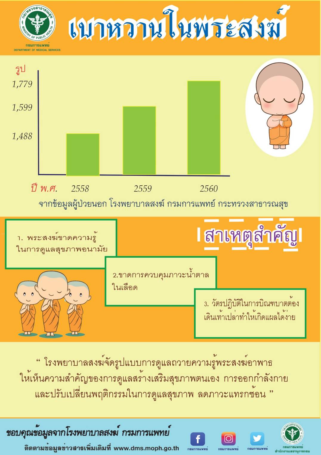 นายแพทย์สมศักดิ์ อรรฆศิลป์ อธิบดีกรมการแพทย์ กล่าวว่า จากสถิติของโรงพยาบาลสงฆ์ กรมการแพทย์ปี 2560 พบพระสงฆ์ที่อาพาธเข้ารับการรักษาด้วยโรคไม่ติดต่อเรื้อรังเพิ่มขึ้น โดยเฉพาะโรคเบาหวานซึ่งเป็นกลุ่มอาการที่เกิดจากความผิดปกติของร่างกายที่ไม่สามารถใช้น้ำตาลได้ตามปกติ ทำให้ระดับน้ำตาลในเลือดสูงและถูกขับออกมาทางปัสสาวะ เนื่องจากร่างกายขาดฮอร์โมนอินซูลินจากการที่ตับอ่อนผลิตไม่พอใช้หรือผลิตแล้วใช้ไม่ได้ตามปกติ ทำให้เกิดโรคแทรกซ้อนทั้งเฉียบพลันและเรื้อรัง ส่งผลทำให้หลอดเลือดเสื่อม เสียหาย และทำลายอวัยวะอื่นๆ เช่น ไต สมอง หัวใจ เป็นต้น จากการที่ทีมสหวิชาชีพ โรงพยาบาลสงฆ์ ทำการศึกษาและประเมินผู้ป่วยเบาหวาน ที่มารับบริการ พบพระสงฆ์อาพาธด้วยโรคเบาหวานเพิ่มขึ้นต่อเนื่อง โดยสถิติผู้ป่วยนอก ปี 2558 พบจำนวน 1,488 รูป ปี 2559 จำนวน 1,599 รูป และปี 2560 จำนวน 1,779 รูป ตามลำดับ นอกจากนี้ยังพบว่าพระสงฆ์ที่อาพาธบางรายต้องตัดอวัยวะบางส่วน เช่น นิ้วเท้าบางนิ้วหรือหลายนิ้วไปจนถึงตัดถึงข้อเท้า ซึ่งสาเหตุสำคัญของการเกิดโรคพบว่าพระสงฆ์ขาดความรู้ในการดูแลสุขภาพอนามัยทั้งจากการควบคุมภาวะน้ำตาลในเลือด ประกอบกับวัตรปฏิบัติในการบิณฑบาตเป็นประจำ ต้องเดินเท้าเปล่าทำให้เกิดแผลได้ง่าย และเมื่อเกิดแผลแล้วไม่ได้รับการรักษาจะทำให้เป็นแผลเรื้อรังถึงขั้นต้องตัดอวัยวะบางส่วน