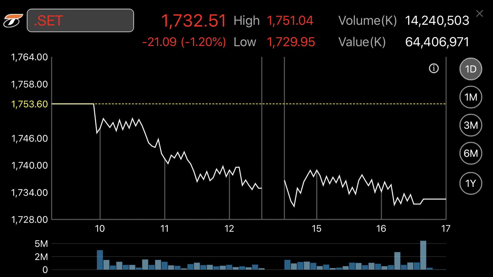 ผู้สื่อข่าวรายงานว่าดัชนีตลาดหลักทรัพย์ฯ ปิดวันนี้( 24 พ.ค.) ที่ระดับ 1,732.51 จุด ลดลง 21.09 จุด หรือร้อยละ1.20 มูลค่าการซื้อขาย 64,406.97 ล้านบาท การซื้อขายหุ้นวันนี้ ดัชนีหุ้นไทยเคลื่อนไหวในแดนลบตลอดทั้งวัน โดยดัชนีฯแตะจุดสูงสุดที่ 1,751.04 จุด และต่ำสุดที่ระดับ 1,729.95 จุด