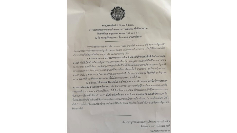 ทำเนียบฯ 25 พ.ค.- ที่ประชุมคณะกรรมการบริหารสถานการณ์ฉุกเฉิน เกี่ยวกับการแก้ไขปัญหาจังหวัดชายแดนภาคใต้ วันนี้ (25 พ.ค.) มี พล.อ.ประวิตร วงษ์สุวรรณ รองนายกรัฐมนตรี และรัฐมนตรีว่าการกระทรวงกลาโหม เป็นประธาน โดยที่ประชุมมีมติขยายระยะเวลาการประกาศสถานการณ์ฉุกเฉินที่มีความร้ายแรงในจังหวัดชายแดนภาคใต้ออกไปอีก 3 เดือน ตั้งแต่วันที่ 20 มิถุนายน 2561 – 19 กันยายน 2561 เป็นการขยายครั้งที่ 52 โดยการประกาศสถานการณ์ฉุกเฉินในเขตพื้นที่ จ.นราธิวาส จะยกเว้น อ.สุไหง โก-ลก จ.ยะลา ยกเว้น อ.เปตง และ จ.ปัตตานี ยกเว้น อ.แม่ลาน