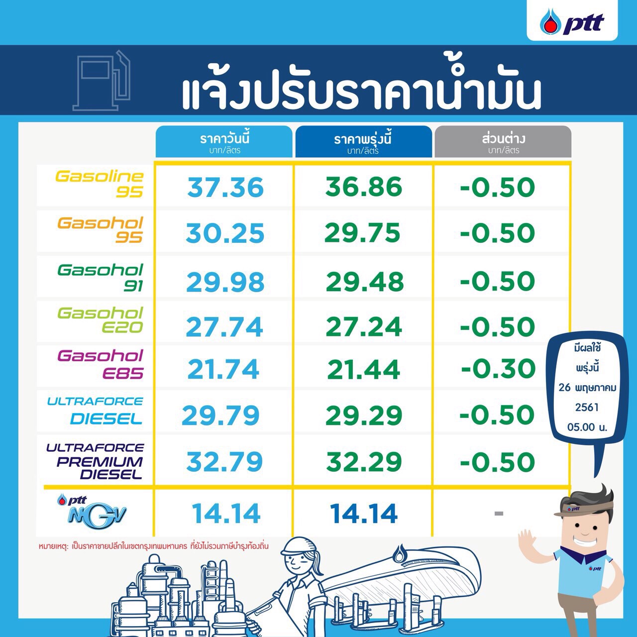ล่าสุดคาดว่าวันนี้ (25 พ.ค.) ราคาน้ำมันตลาดโลกน่าจะเริ่มมีแนวโน้มลดลงบ้าง ปตท.จึงปรับลดราคาน้ำมันลงทันที แม้ว่าราคาน้ำมันตลาดโลกภายหลังการปรับตัวลงจะยังคงอยู่ในระดับสูงก็ตาม โดยกลุ่มเบนซิน ลดลง 50 สตางค์/ลิตร เว้น E85 ลดลง 30 สตางค์/ลิตร และกลุ่มดีเซล ลดลง 50 สตางค์/ลิตร มีผลวันพรุ่งนี้ (26 พ.ค.) เวลา 05.00 น. เป็นต้นไป ส่งผลให้ราคาน้ำมันขายปลีกในเขต กทม. และปริมณฑลเป็น ดังนี้ (โดยราคาขายปลีกข้างต้นยังไม่รวมภาษีบำรุงกรุงเทพมหานคร) เบนซิน 95 อยู่ที่ 36.86 บาท/ลิตร แก๊สโซฮอล์ 95 อยู่ที่ 29.75 บาท/ลิตร แก๊สโซฮอล์ 91 อยู่ที่ 29.48 บาท/ลิตร E20 อยู่ที่ 27.24 บาท/ลิตร E85 อยู่ที่ 21.44 บาท/ลิตร และดีเซล 29.29 บาท/ลิตร