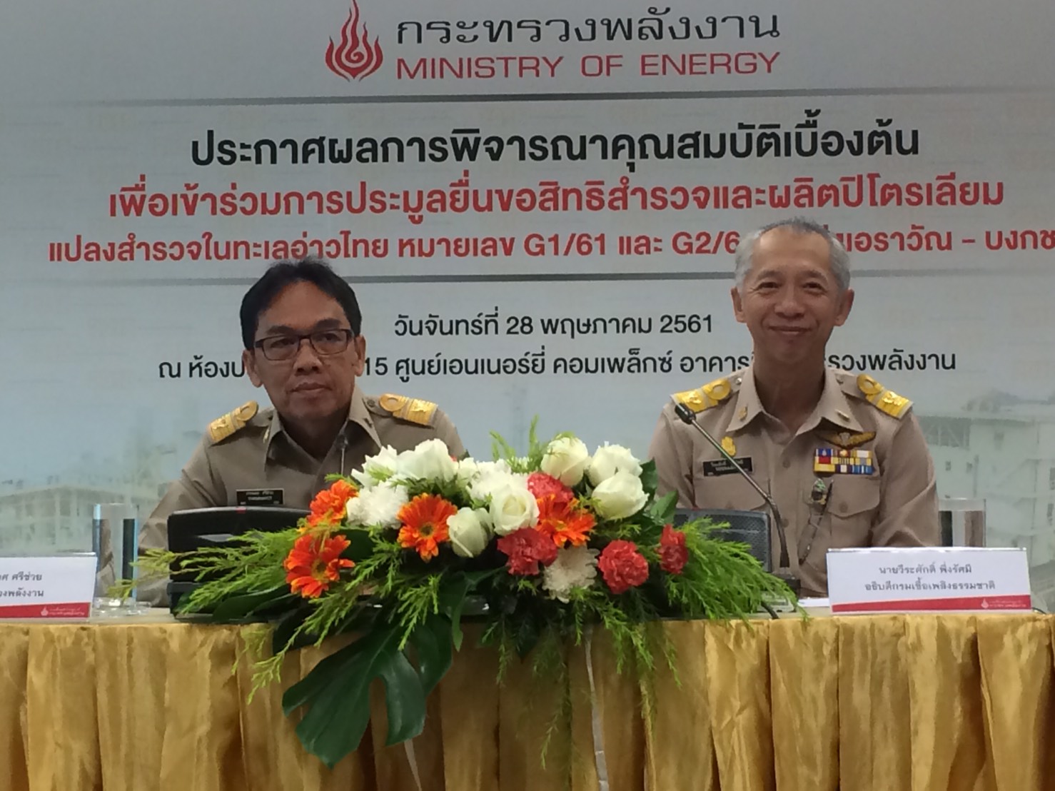 นายวีระศักดิ์ พึ่งรัศมี อธิบดีกรมเชื้อเพลิงธรรมชาติ เปิดเผยว่า ภายหลังจากที่ผู้ประกอบการได้ส่งหลักฐานแสดงคุณสมบัติเบื้องต้นตามหลักเกณฑ์ที่กรมเชื้อเพลิงธรรมชาติกำหนด เพื่อเข้าร่วมประมูลยื่นขอสิทธิสำรวจและผลิตปิโตรเลียมแปลงสำรวจในทะเลอ่าวไทย แปลง G1/61 และ G2/61 (แหล่งเอราวัณและบงกช) เมื่อวันที่ 15-16 พฤษภาคมที่ผ่านมา ขณะนี้ได้มีการพิจารณาคุณสมบัติเบื้องต้นเป็นที่เรียบร้อยแล้ว โดยมีผู้ที่ผ่านคุณสมบัติเบื้องต้น และมีสิทธิเข้าร่วมประมูลยื่นขอสิทธิสำรวจและผลิตปิโตรเลียมแปลงสำรวจในทะเลอ่าวไทย แปลง G1/61 (แหล่งเอราวัณ) จำนวน 5 บริษัท ได้แก่ บริษัท Chevron Thailand Holdings Ltd., บริษัท PTTEP Energy Development Company Limited, บริษัท MP G2 (Thailand) Limited, บริษัท Total E&P Thailand, บริษัท OMV Aktiengesellschaft และ แปลง G2/61 (แหล่งบงกช) จำนวน 4 บริษัท ได้แก่ บริษัท Chevron Thailand Holdings Ltd., บริษัท PTTEP Energy Development Company Limited, บริษัท MP L21 (Thailand) Limited, บริษัท OMV Aktiengesellschaft