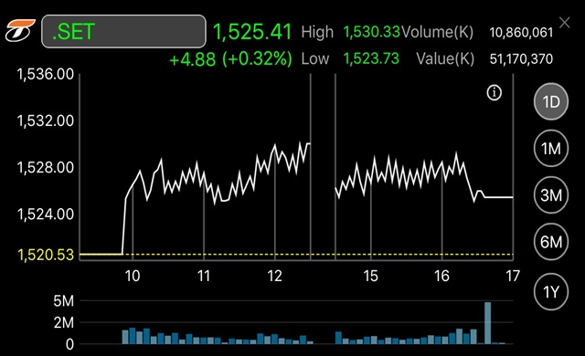 กรุงเทพ 8 ธ.ค. – ผู้สื่อข่าวรายงานว่าดัชนีตลาดหลักทรัพย์ฯ ปิดการซื้อขายที่ระดับ 1,525.41 จุด เพิ่มขึ้น 4.88 จุด หรือร้อยละ 0.3 มูลค่าการซื้อขาย 51,170.37 ล้านบาท