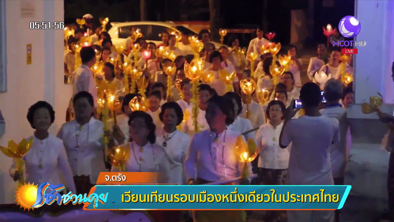 ตรัง 30 พ.ค.-พุทธศาสนิกชนชาว อ.กันตัง จ.ตรัง ฟื้นประเพณีแห่เทียนรอบเมืองเนื่องในวันวิสาขบูชา แห่งเดียวในตรัง หนึ่งเดียวในประเทศไทย ประดิษฐ์โคมเทียนกลีบดอกบัว นำไม้ระกำมาทำเป็นก้านเชิงเทียนดอกบัว ตามความเชื่อหมดทุกข์หมดกรรม