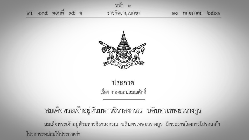 ทั้งนี้ ตั้งแต่บัดนี้เป็นต้นไป ยกเว้นลําดับที่ 3 5 6 และ 7 ตั้งแต่วันที่ 24 พฤษภาคม 2561 ซึ่งเป็นวันที่ถูกจับกุมและสละสมณเพศ ประกาศ ณ วันที่ 29 พฤษภาคม พ.ศ.2561 เป็นปีที่ 3 ในรัชกาลปัจจุบัน ผู้รับสนองพระราชโองการ พล.อ.ประยุทธ์ จันทร์โอชา นายกรัฐมนตรี