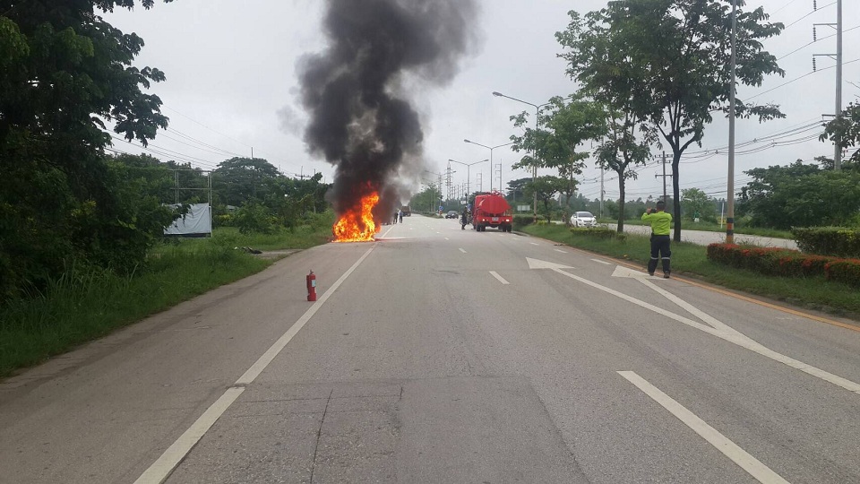 เลย 30 พ.ค.- ดาบตำรวจเมืองเลยขับเก๋งจะไปทำงานประสบเหตุระทึกกลางทาง ไฟลามรถวอดทั้งคันไม่ทราบสาเหตุ ส่วนเจ้าตัวปลอดภัย