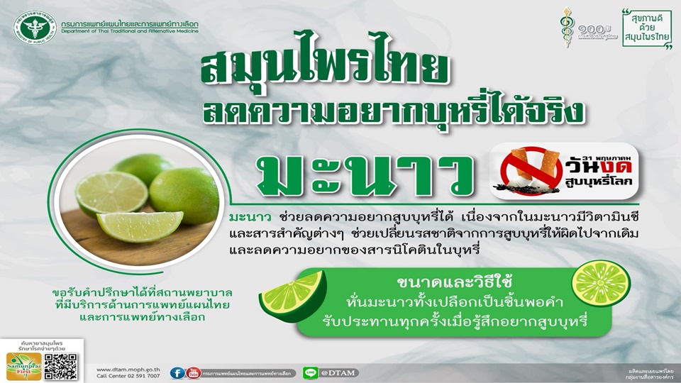 กรมการแพทย์แผนไทย 31 พ.ค..-หมอแนะใช้ชาหญ้าดอกขาว หรือเคี้ยวมะนาว ช่วยลดความอยากบุหรี่ได้ เหมาะสำหรับผู้ตั้งใจเลิกบุหรี่อย่างแท้จริง