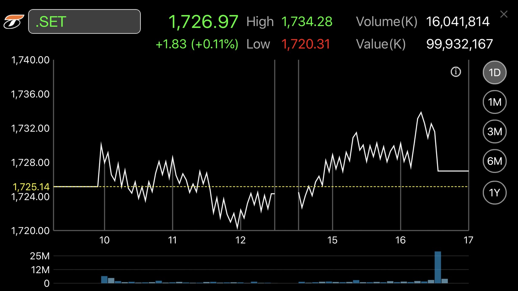 การซื้อขายหุ้นวันนี้ ดัชนีหุ้นไทยเคลื่อนไหวทั้งในแดนบวก-ลบ โดยดัชนีฯแตะจุดสูงสุดที่ 1,734.28 จุด และแตะจุดต่ำสุดที่ระดับ 1,720.31 จุด