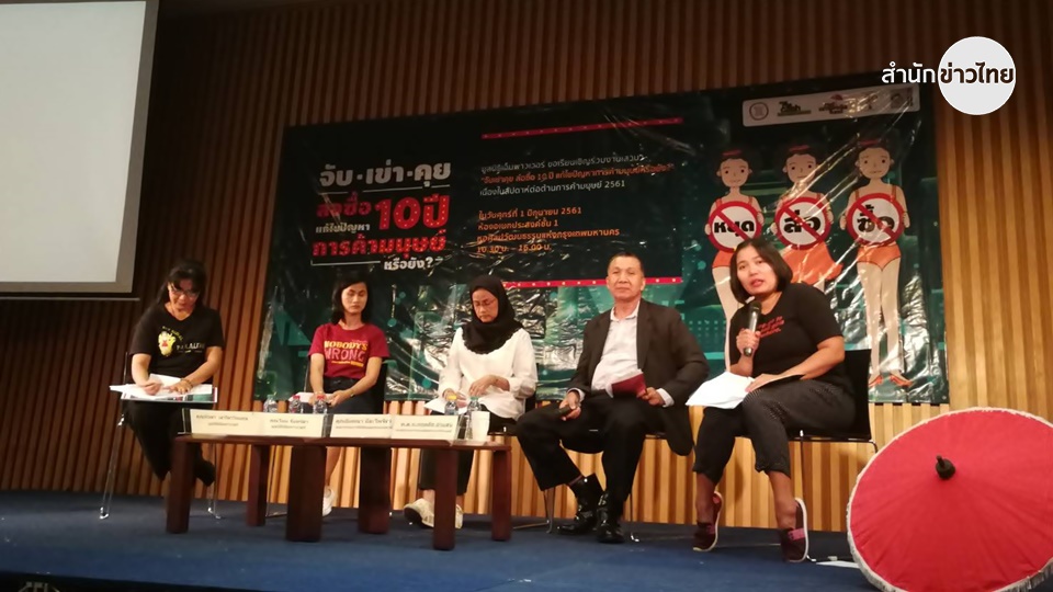 ปทุมวัน 1 มิ.ย.-เวทีเสวนา‘จับเข่าคุยล่อซื้อ10ปี แก้ไขปัญหาการค้ามนุษย์หรือยัง’ เผยสถิติ 10 ปี ที่ล่อซื้อมีผู้หญิงขายบริการถูกจับถึง 3 หมื่นคน เรียกร้องรัฐยกเลิก แนะคุ้มครองผู้เสียหาย ด้วยกฎหมายแรงงาน