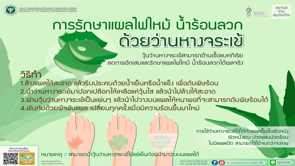 นพ.ปราโมทย์ เสถียรรัตน์ รองอธิบดีกรมการแพทย์แผนไทยและการแพทย์ทางเลือก ในฐานะโฆษกกรมฯ กล่าวว่า วิธีการรักษาแผลไฟไหม้ น้ำร้อนลวก ด้วยศาสตร์การแพทย์แผนไทย คือ หากเกิดแผลไฟไหม้ น้ำร้อนลวก ในระดับที่ความร้อนยังทำลายไม่ถึงชั้นผิวหนังแท้ ให้รีบประคบด้วยน้ำเย็นหรือน้ำแข็ง เพื่อดับพิษร้อนในขั้นแรก จากนั้นนำใบว่านหางจระเข้ปอกเปลือกให้เหลือแค่วุ้นใส ๆ แล้วล้างยางสีเหลืองด้วยน้ำเปล่าให้สะอาด ฝานเป็นแผ่นบาง ๆ นำไปวางบนแผลให้ทั่วบริเวณแผลเพื่อลดอาการปวดแสบปวดร้อน พันด้วยผ้าพันแผล เปลี่ยนตัวยาทุกครั้งที่มีอาการร้อนขึ้นมาใหม่ หรืออาจจะนำวุ้นว่านหางจระเข้ไปแช่เย็นก่อนนำมาวางบนแผลก็ได้ จากการศึกษาวิจัยพบว่า วุ้นใสของใบว่านหางจระเข้สามารถต้านเชื้อแบคทีเรีย ลดการอักเสบ รักษาแผลไฟไหม้น้ำร้อนลวกได้ผลจริง
