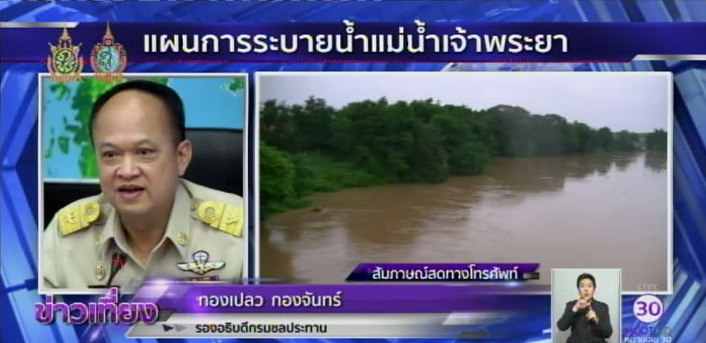 อสมท 26 ก.ย. -นายทองเปลว กองจันทร์ รองอธิบดีกรมชลประทาน ให้สัมภาษณ์ทางโทรศัพท์กับสำนักข่าวไทย อสมท ถึงแผนการระบายน้ำของกรมชลประทาน หลังจากปริมาณน้ำแม่น้ำเจ้าพระยาล้นตลิ่งในจังหวัดภาคกลาง เช่น พระนครศรีอยุธยา และอ่างทอง ซึ่งเป็นพื้นที่ลุ่มได้รับผลกระทบ รวมถึงกรณีกรมอุตุนิยมวิทยาคาดว่าตอนบนของประเทศจะมีฝนตกเพิ่มขึ้นในวันนี้ ภาคเหนือและอีสานตอนล่างจะมีฝนตก ช่วงวันที่ 26-29 ก.ย. แต่หลังจากวันที่ 30 ก.ย. ร่องมรสุมจะขยับมาที่ภาคเหนือตอนล่าง ภาคกลาง ฝนตกต่อเนื่องไปถึงวันที่ 2 ต.ค. – สำนักข่าวไทย