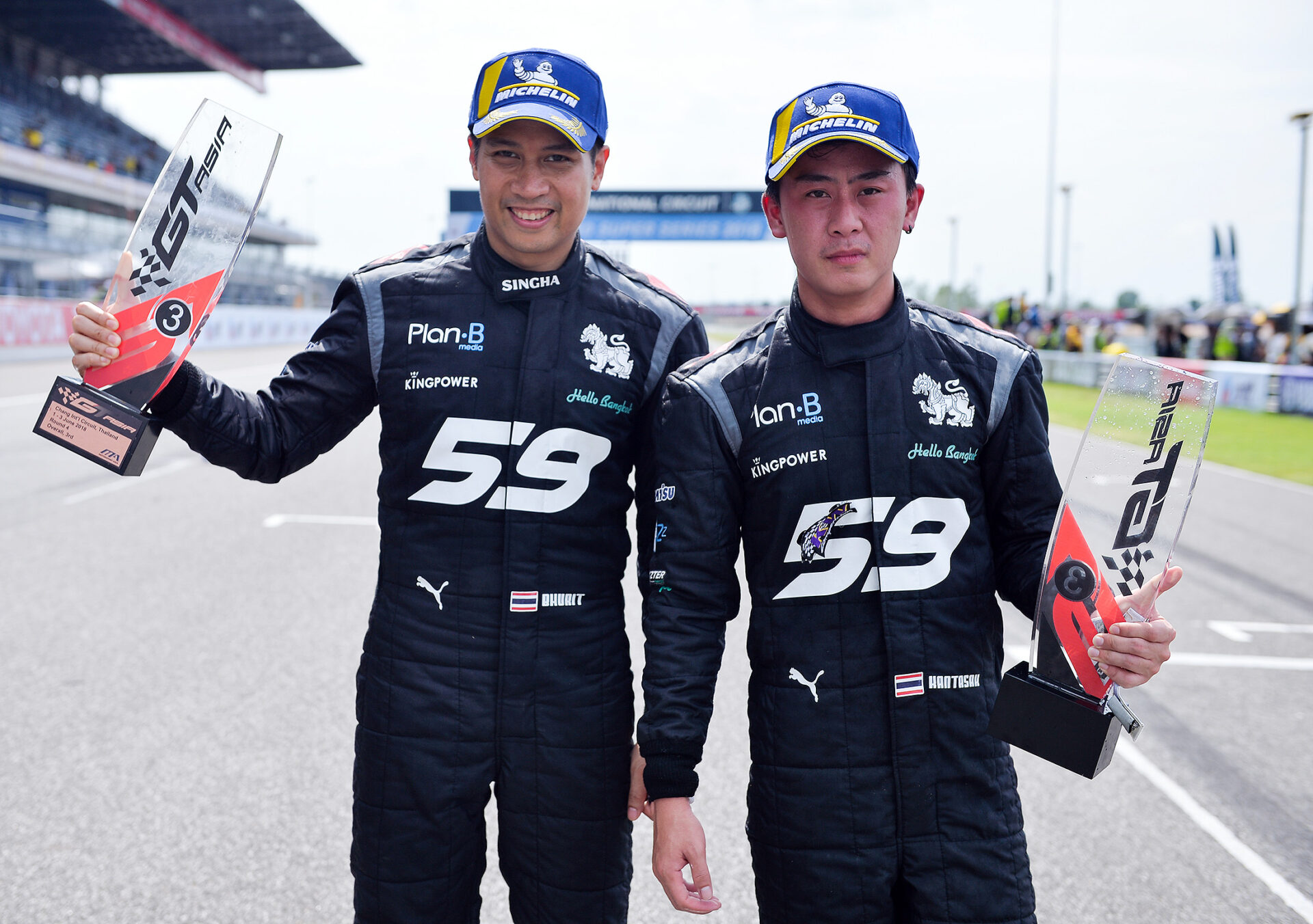 “เต้” ภูริต ภิรมย์ภักดี และ “แบงค์” กันตศักดิ์ กุศิริ สองนักขับทีมสิงห์ แพลน-บี บาย แอบโซลูท เรซซิ่ง ขึ้นโพเดี้ยมในการแข่งขันรถยนต์ทางเรียบ “จีที เอเชีย ซีรีส์ 2018” สนามสอง เรซสอง ที่ จ.บุรีรัมย์ เมื่อวันที่ 3 มิ.ย.ที่ผ่านมา