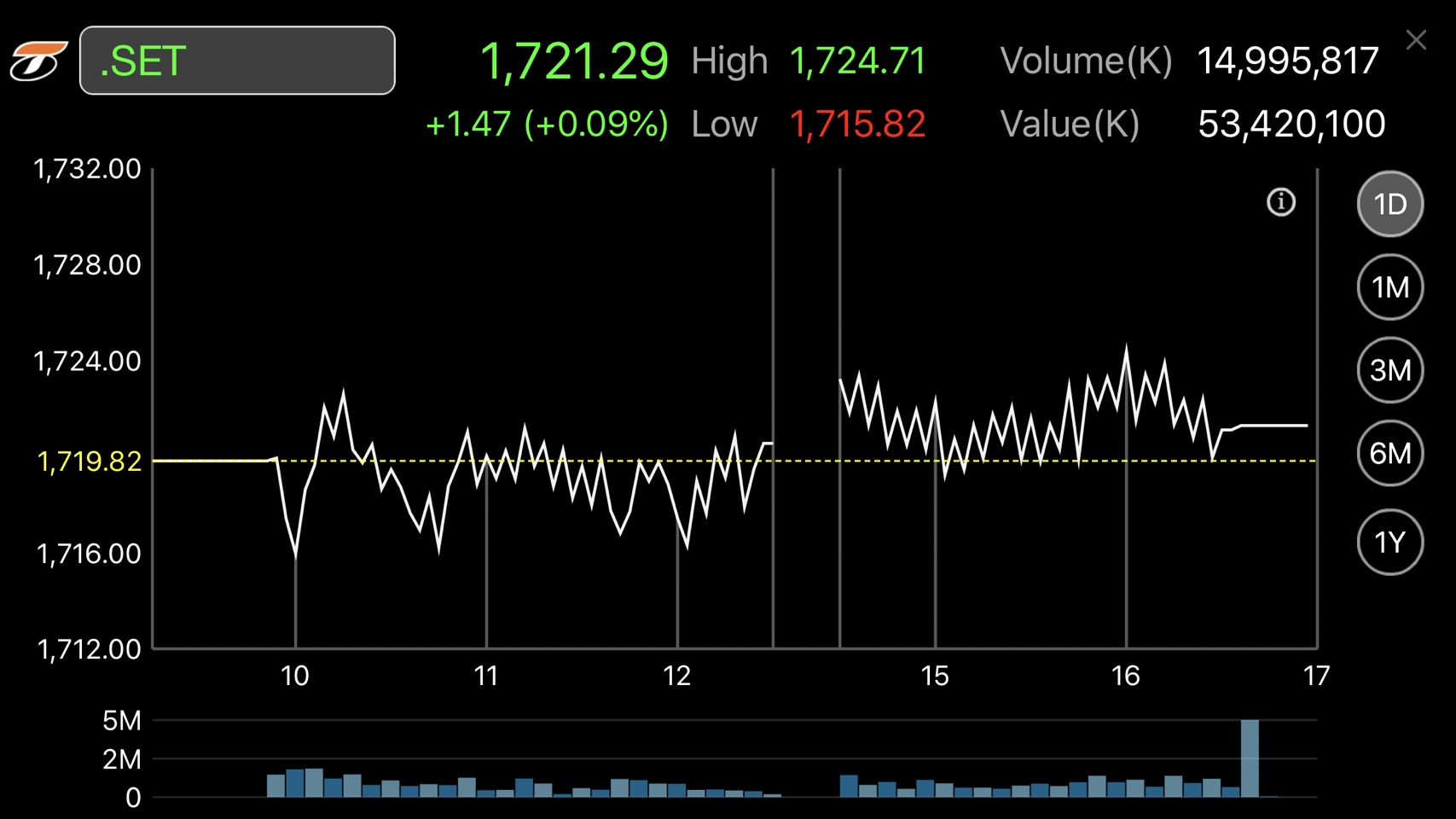 ผู้สื่อข่าวรายงานว่าดัชนีตลาดหลักทรัพย์ฯ ปิดวันนี้ (4 มิ.ย.) ที่ระดับ 1,721.29 จุด เพิ่มขึ้น 1.47 จุด หรือร้อยละ 0.09 มูลค่าการซื้อขาย 53,420.10 ล้านบาท การซื้อขายหุ้นวันนี้ดัชนีหุ้นไทยเคลื่อนไหวแคบ ๆ ทั้งแดนบวก-ลบ โดยดัชนีฯ แตะจุดสูงสุดที่ 1,724.71 จุด และแตะจุดต่ำสุดที่ระดับ 1,715.82 จุด