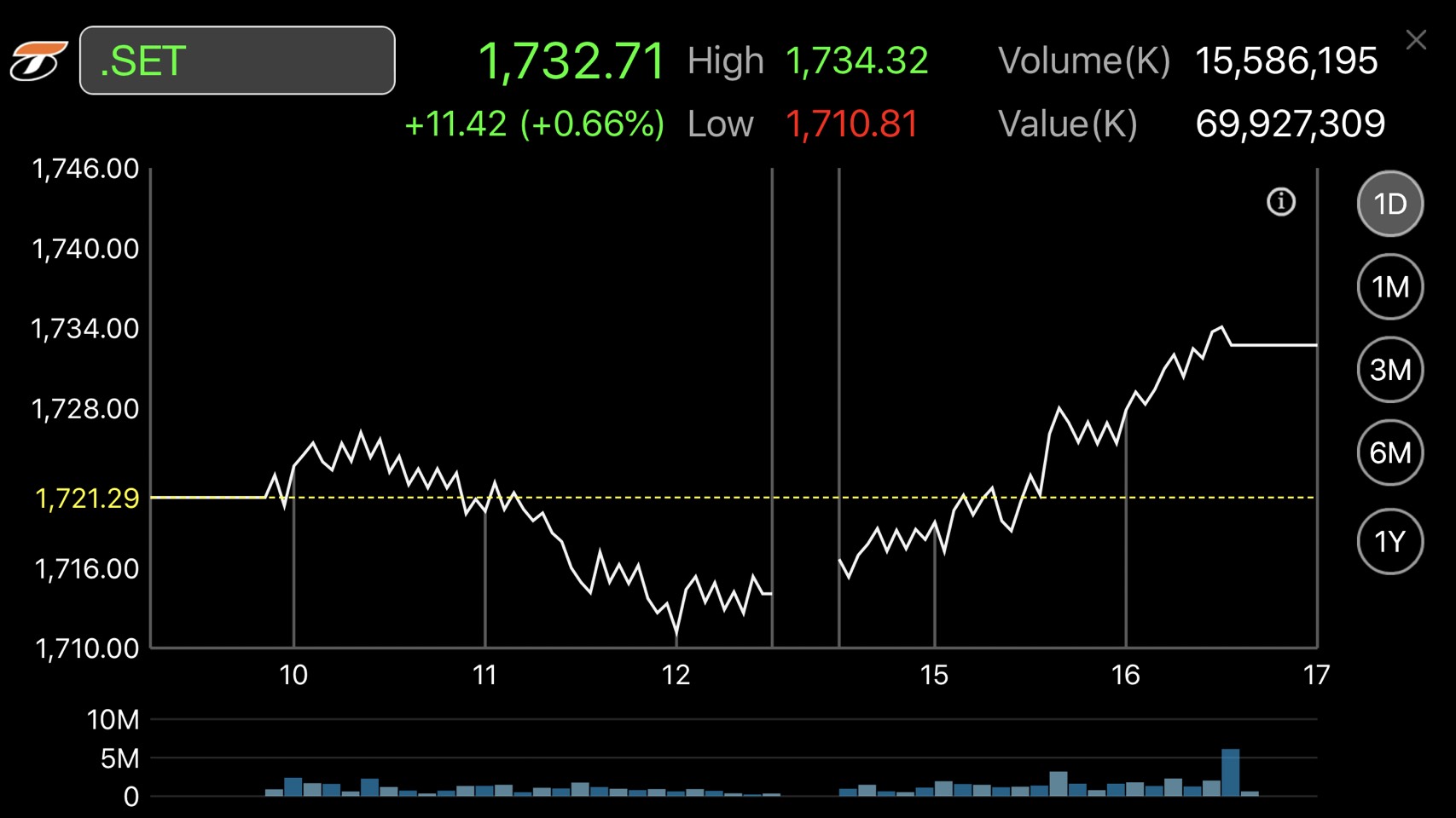 ผู้สื่อข่าวรายงานว่าดัชนีตลาดหลักทรัพย์ปิดวันนี้ที่ระดับ 1,732.71 จุด เพิ่มขึ้น 11.42 จุด หรือร้อยละ 0.66 มูลค่าการซื้อขาย 69,927.31 ล้านบาท การซื้อขายหุ้นวันนี้ดัชนีหุ้นไทยเคลื่อนไหวทั้งแดนบวก-ลบ โดยดัชนีฯ แตะจุดสูงสุดที่ 1,734.32 จุด และต่ำสุดที่ระดับ 1,710.81 จุด