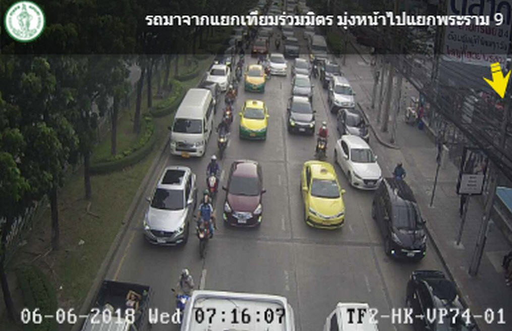 ถนนรัชดาภิเษก ขาเข้า แยกเทียมร่วมมิตร มุ่งหน้าแยกพระราม9 เข้าถนนอโศกมนตรี รถมาก ท้ายสะสมใกล้แยกเทียมร่วมมิตร