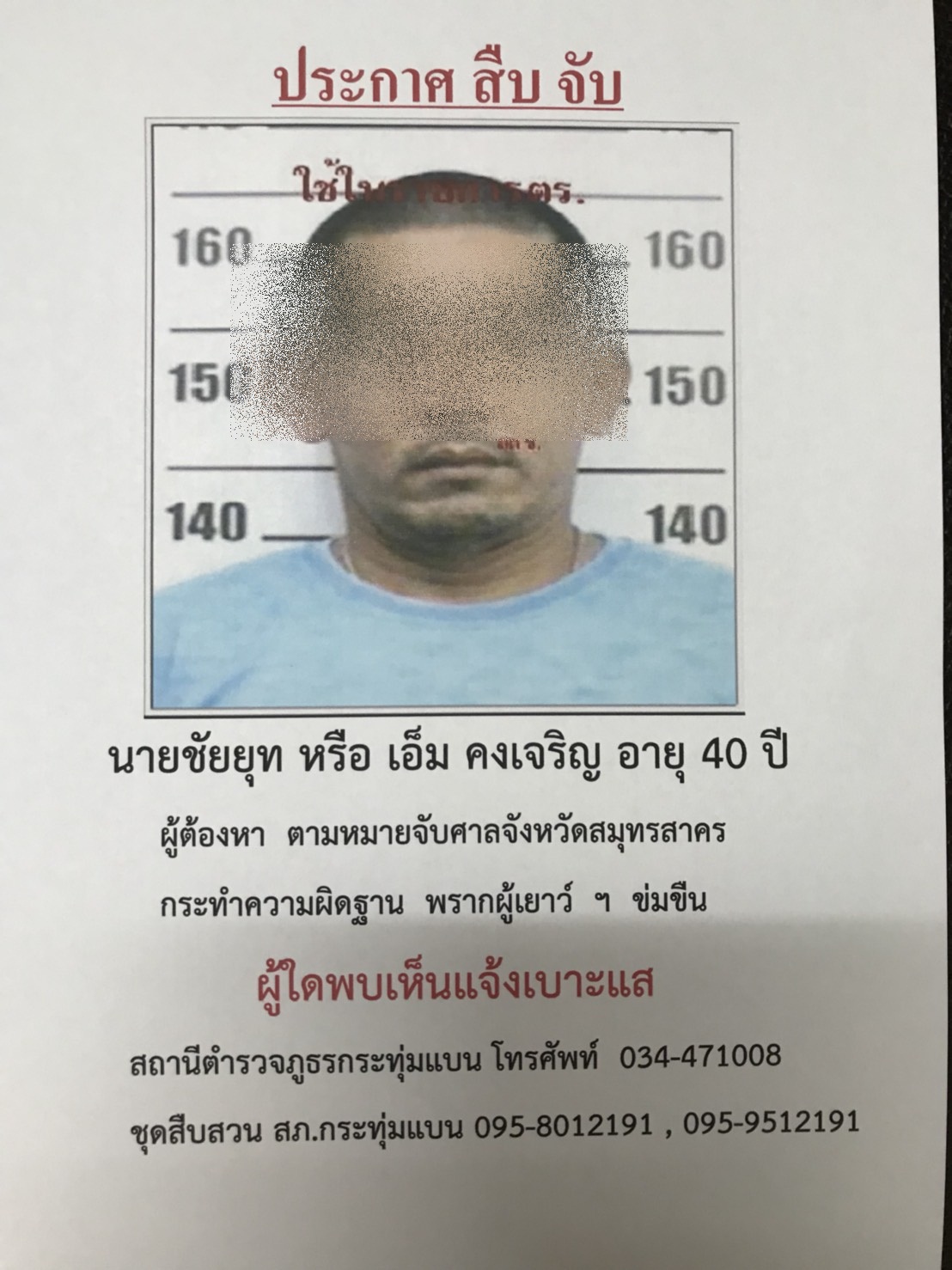 ล่าสุด เจ้าหน้าที่ได้รวบรวมเอกสารหลักฐานเสนอขออำนาจศาลจังหวัดสมุทรสาครและอนุมัติหมายจับเรียบร้อยแล้ว คือ นายชัยยุท หรือเอ็ม คงเจริญ อายุ 40 ปี พ่อเลี้ยงของเด็กในข้อกล่าวหาพรากเด็กอายุยังไม่เกินสิบห้าปีไปเสียจากบิดามารดา ผู้ปกครอง หรือผู้ดูแล เพื่อการอนาจาร, พาเด็กอายุยังไม่เกินสิบห้าปีไปเพื่อการอนาจาร แม้ผู้นั้นจะยินยอมก็ตาม และกระทำชำเราเด็กอายุยังไม่เกินสิบสามปี ซึ่งมิใช่ภริยาหรือสามีของตน โดยเด็กนั้นจะยินยอมหรือไม่ก็ตาม หน่วงเหนี่ยวหรือกักขังผู้อื่น หรือกระทำด้วยประการใดให้ผู้อื่นปราศจากเสรีภาพในร่างกาย ทำร้ายร่างกายผู้อื่นจนเป็นเหตุให้ได้รับอันตรายแก่กายหรือจิตใจ พร้อมกันนี้ได้แจ้งประกาศหมายจับให้ทราบทั่วกันแล้วทุกช่องทาง รวมถึงสื่อโซเชียล หากผู้ใดพบเบาะแสแจ้งได้ที่ สภ.กระทุ่มแบน หมายเลขโทรศัพท์ 034-401-008 หรือชุดสืบสวน สภ.กระทุ่มแบน โทรศัพท์ 095-801-2191 และ 095-951-2191