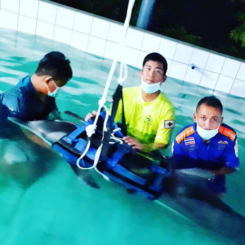 ภูเก็ต 7 มิ.ย.- ที่ศูนย์วิจัยและพัฒนาทรัพยากรทางทะเลและชายฝั่งอันดามัน แหลมพันวา ต.วิชิต อ.เมือง จ.ภูเก็ต สัตวแพทย์ประจำกลุ่มสัตว์ทะเลหายาก เฝ้าดูอาการของโลมาในบ่ออนุบาลตลอด 24 ชั่วโมง หลังให้การรักษาฉีดยาปฏิชีวนะและยาบำรุง ซึ่งโลมาดังกล่าวชาวบ้านพบเกยตื้นอยู่บริเวณหาดกมลา ใกล้สวนสาธารณะเฉลิมพระเกียรติ 100 ปี หรือสวนสาธารณะอนุสรณ์สึนามิกมลา ม.3 ต.กมลา อ.กะทู้ เมื่อคืนที่ผ่านมา (6 มิ.ย.) จึงรีบแจ้งหน่วยกู้ชีพ อบต.กมลา และชุดปฏิบัติการกู้ภัยทางน้ำ กองกำกับการ 8 กองบังคับการตำรวจน้ำภูเก็ต ช่วยเคลื่อนย้ายส่งให้สัตวแพทย์เร่งรักษา เนื่องจากอาการที่พบอยู่ในสภาพอ่อนแรง หายใจช้า และลักษณะเกร็งเป็นระยะ เจ้าหน้าที่ต้องใช้วิธีการกดนวดเพื่อกระตุ้นหัวใจ