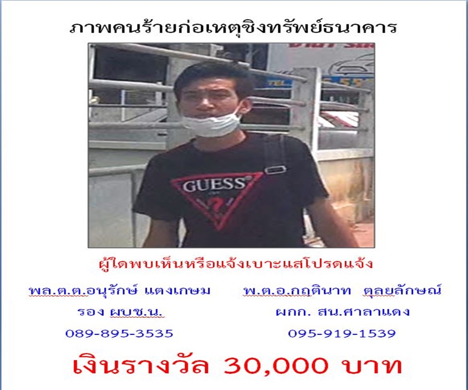 กรุงเทพฯ 7 มิ.ย.- ตำรวจตั้งรางวัลนำจับ 3 หมื่นบาท หาตัวคนร้ายใช้ปืนบุกเดี่ยวจี้ชิงเงินธนาคารไทยพาณิชย์ ย่านบางแวก ขณะที่ข้อมูลชุดสืบสวนพบเบาะแสคนร้ายขับรถกระบะติดป้ายทะเบียนจังหวัดพยางค์เดียวขึ้นทางด่วนหลบหนี