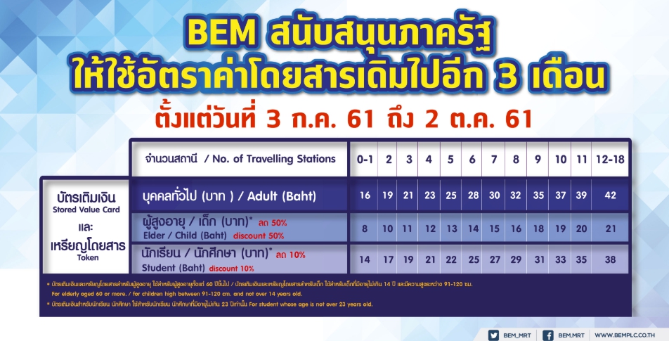 ตามที่บริษัท ทางด่วนและรถไฟฟ้ากรุงเทพ จำกัด (มหาชน) หรือ BEM ได้แจ้งอัตราค่าโดยสารใหม่ของรถไฟฟ้าสายสีน้ำเงิน (สายเฉลิมรัชมงคล) ตั้งแต่วันที่ 3 กรกฎาคม 2561 – 2 กรกฎาคม 2563 นั้น เพื่อเป็นการสนับสนุนนโยบายของภาครัฐที่ต้องการแบ่งเบาภาระของผู้ใช้บริการ โดยใช้อัตราค่าโดยสารเดิม ไปอีก 3 เดือน ตั้งแต่วันที่ 3 กรกฎาคม 2561 ถึงวันที่ 2 ตุลาคม 2561 .-สำนักข่าวไทย