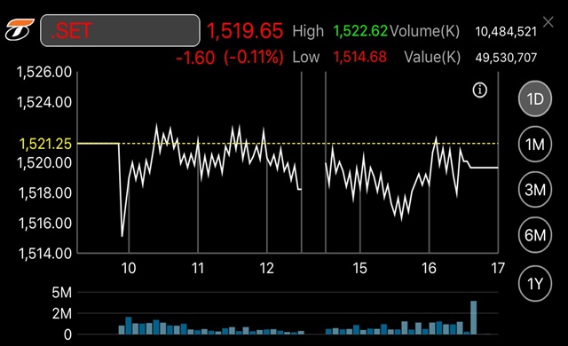 กรุงเทพ ฯ 15 ม.ค. – ผู้สื่อข่าวรายงานว่าดัชนีตลาดหลักทรัพย์ฯ ปิดวันนี้ (15 ธ.ค.) ที่ระดับ 1,519.65 จุด ลดลง 1.60 จุด หรือ ร้อยละ 0.11 มูลค่าการซื้อขาย 49,530.71 ล้านบาท โดยดัชนีเคลื่อนไหวแดนลบเป็นส่วนใหญ่ ขยับขึ้นแตะจุดสูงสุดของวันที่ระดับ 1,522.62 จุด และดัชนีจุดต่ำสุดของวันอยู่ที่ 1,514.68 จุด