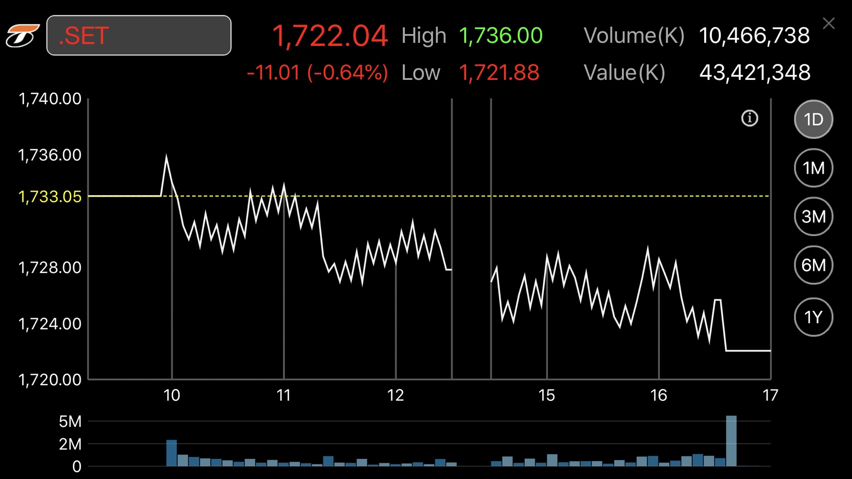 ผู้สื่อข่าวรายงานว่าดัชนีตลาดหลักทรัพย์ฯ ปิดวันนี้ (8 มิ.ย.) ที่ระดับ 1,722.04 จุด ลดลง 11.01 จุด หรือร้อยละ 0.64 มูลค่าการซื้อขาย 43,421.35 ล้านบาท การซื้อขายหุ้นวันนี้ดัชนีหุ้นไทยเคลื่อนไหวทั้งแดนลบเป็นส่วนใหญ่ โดยดัชนีฯ แตะจุดสูงสุดที่ 1,736.00 จุด และต่ำสุดที่ระดับ 1,721.88 จุด ตลาดหุ้นไทยลดลงเหมือนกับในภูมิภาคและตลาดหุ้นยุโรปที่ปรับตัวลดลงตามกัน จากความกังวลเกี่ยวกับการประชุม G7 ในวันที่ 8-9 มิถุนายนนี้ เกี่ยวกับประเด็นการเจรจาทางการค้า ทำให้มีแรงขายออกมากดดันดัชนีย่อตัวลง