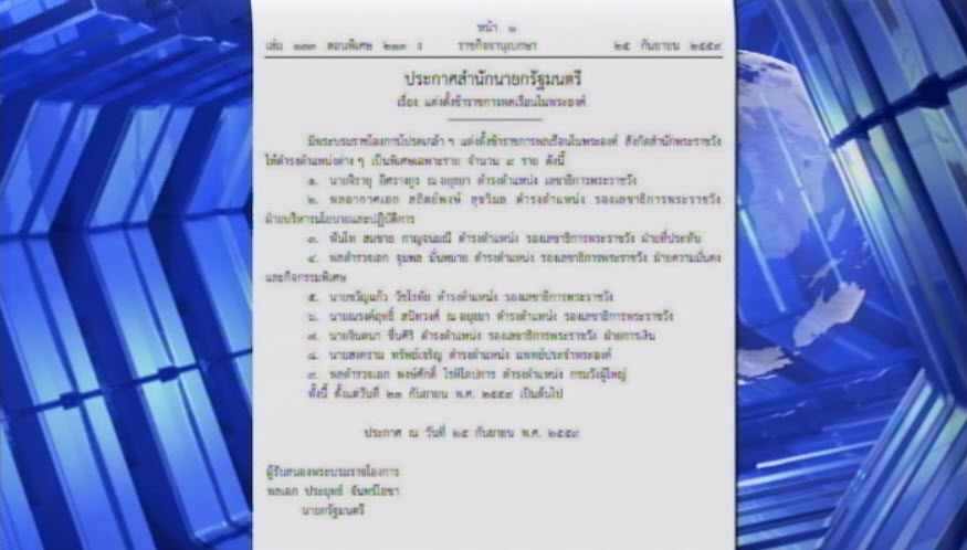 กรุงเทพฯ 25 ก.ย. – มีพระบรมราชโองการ โปรดเกล้าฯ แต่งตั้งข้าราชการพลเรือนในพระองค์ สังกัดสำนักพระราชวัง ให้ดำรงตำแหน่งต่างๆ เป็นพิเศษเฉพาะราย จำนวน 9 ราย โดยนายจิรายุ อิศรางกูร ณ อยุธยา ดำรงตำแหน่ง เลขาธิการพระราชวัง ทั้งนี้ ตั้งแต่วันที่ 23 กันยายน พ.ศ. 2559 เป็นต้นไป. -สำนักข่าวไทย