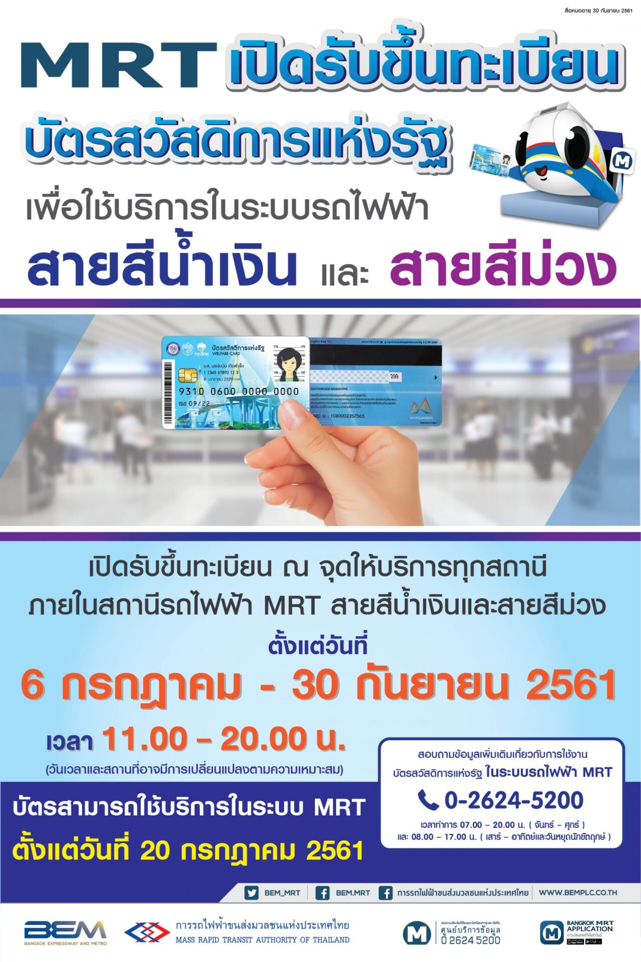 บริษัท ทางด่วนและรถไฟฟ้ากรุงเทพ จำกัด (มหาชน) หรือ BEM แจ้งกำหนดการเปิดรับขึ้นทะเบียนบัตรสวัสดิการแห่งรัฐเพื่อใช้บริการในระบบรถไฟฟ้า MRT โดยนำบัตรสวัสดิการแห่งรัฐมาขึ้นทะเบียนเพื่อรับสิทธิ์ ณ จุดให้บริการทุกสถานีภายในสถานีรถไฟฟ้า MRT สายสีน้ำเงินและสายสีม่วง ตั้งแต่วันที่ 6 กรกฎาคม – 30 กันยายน 2561 เวลา 11.00 – 20.00 น. (วัน เวลา และสถานที่อาจมีความเปลี่ยนแปลงตามความเหมาะสม) บัตรสามารถใช้บริการในระบบรถไฟฟ้า MRT ทั้งสองสายได้ตั้งแต่วันที่ 20 กรกฎาคม 2561 เป็นต้นไป สอบถามรายละเอียดเพิ่มเติมได้ที่ศูนย์บริการข้อมูลโทร. 0-2624-5200.- สำนักข่าวไทย