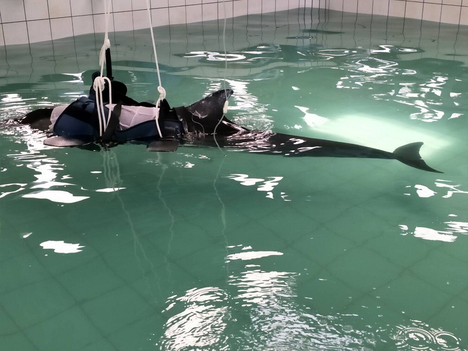 กรณีเจ้าหน้าที่กลุ่มสัตว์ทะเลหายาก ศูนย์วิจัยและพัฒนาทรัพยากรทางทะเลและชายฝั่งทะเลอันดามัน ต.วิชิต อ.เมือง จ.ภูเก็ต นำโลมาลายแถบเพศผู้ มาอนุบาลในบ่อพัก เนื่องจากถูกคลื่นซัดขึ้นมาเกยตื้นหน้าหาดกมลาเมื่อวันที่ 6 พ.ย.ที่ผ่านมา ในสภาพอ่อนแรง ต้องใช้เสื้อชูชีพพยุงไว้ตลอดเวลา พร้อมให้น้ำเกลือและเจาะเลือดเพื่อประเมินผลการรักษาและดูอาการเป็นรายชั่วโมง